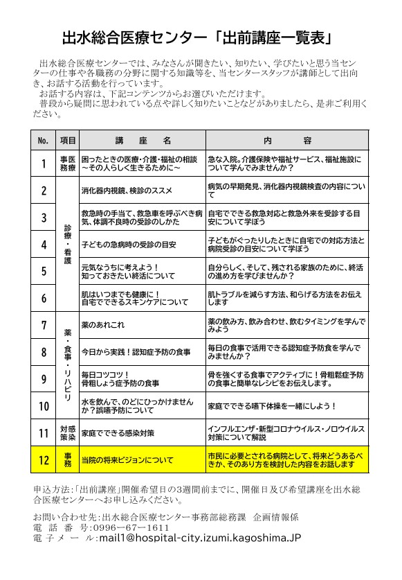 出水総合医療センター「出前講座一覧表」をご参照ください。